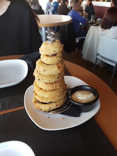 Sus alitas de pollo no están mal como entrante pero los aros de cebolla con sus salsa alemana están mucho mejor.