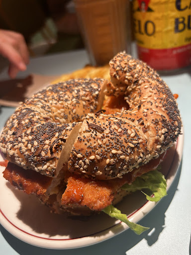 Edit: since somebody is apparently actually taking reviews into account I will take this at face value and clarify what happened. On arrival, the host had a cold demeanor and told us to sit “wherever is clean” instead of being indicated (was our table clean? Probably, but it created a sense of unease and the table we chose was certainly greasy. What was clear is we felt like she did not care much either way) then the waitress took a long time to give us the menu (we had to flag her when other customers arrived and she took their orders’ first, as perhaps the hostess did not communicate there were new customers at the back and nobody noticed us), and then a long time to take our orders. The bagel kind we wanted were not available, but we quickly switched. After long enough we thought we were getting our food, she came back to tell us we’d have to order again as they were cleaning the fryer and no fried chicken was available - unclear why she did not clarify more quickly as we were quite hungry by that point and had already modified our order. Once the food arrived, it was quite good and we even took ordered some home by the counter, but observing how slowly and disinterestedly they worked gave us the impression these were inexperienced people more interested in discussing amongst themselves than managing a busy place - this probably works fine on a relatively calm day, but not what I would’ve expected on Saturday afternoon when there is an expectation that many customers will be there. It’s worth mentioning the restaurant wasn’t fully packed either, I’d say 3/4 full and it seemed well-staffed relative to other places of a similar capacity, so it was a little hard to understand why everything felt so slow and...