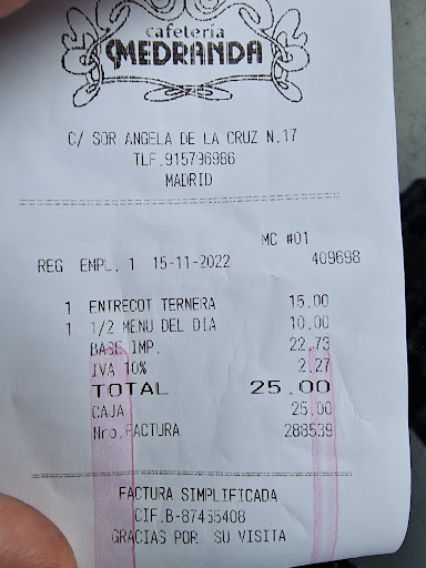 Read morePongo una estrella porque no se puede poner menos,entramos y no nos saludaron siquiera,nos fuimos a sentar y no nos atendió nadie pasados 20 minutos y cuando vino el camarero no mostró muchas ganas en atendernos. Le pedí un croissant y a las 10 de la mañana me dijo que no tenia ( que bueno a lo mejor eso no era culpa suya ) así que me pedí un pan con tomate y Jamón y mi amiga lo mismo y dos zumos de naranja y cada una su café, le pedí un vaso de agua en el momento q pedimos el desayuno y luego desayunando y luego cuando pedí la cuenta se lo volví a pedir,nunca llegó el vaso de agua. Nos trajeron el zumo y el café y el pan lo estuvimos esperando mucho rato para el poco trabajo que tenían en ese momento ,cuando llega el jamón estaba duro y no era es que fuera una porción a corde con su precio. Terminamos y pido la cuenta con el vaso de agua que nunca llegó y cuando veo el precio es de 17'80 . Nos sorprendimos porque aunque sea Madrid no deja de ser un desayuno y pues tampoco es que la atención y el servicio lo valiese. Mi amiga le dijo que le parecía caro y el chico nos respondió que esos eran sus precios y que todo se pagaba a parte ,el café por un lado ,el jamón por otro, etc...