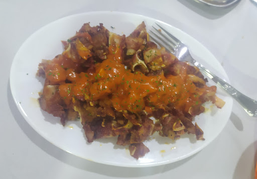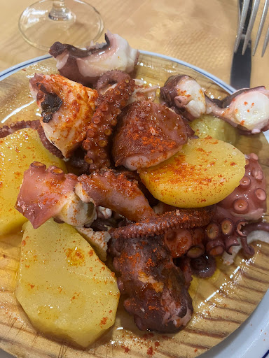 En cuanto a la comida pues he estado leyendo las reseñas y he encontrado el por qué de lo que nos encontramos. Los dueños anteriores se jubilaron y han bajado en calidad y subido precios. Es el resumen. Nos sirvieron un pulpo que no estaba muy allá, no sabemos si era fresco y en cuanto a la oreja nos quedamos con las ganas porque no tenían. Las patatas mixtas no estaban mal.