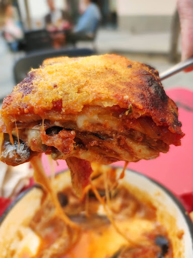 I had a glass of white natural wine; Veg Lasagna soaked in average béchamel sauce with zucchini, very poor taste, apparently heavily heated or microwaved; a side dish of friarielli not fresh, which I did not eat, when I said they tasted as being out of the can, they told me it was not a can but a glass jar! kindly enough they did not calculate this on the bill); ended with a coffee. Final bill €18,60.