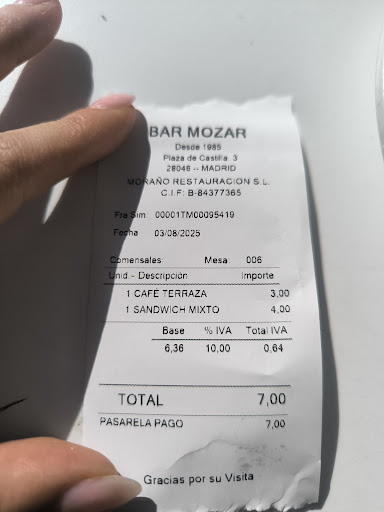 Read moreLos más gigaladrones de todo Madrid. Ayer entré a tomar una café cortado porque tenía que tomar una medicación. Me atiende un chico joven super amable. Le doy 2E, e inocentemente espero la vuelta. Como no vuelve, le pregunto que cuanto cuesta el café, y me dice que 2 E. De la impresión, casi tiene que venir el Samur a atenderme, pero lo más gracioso es que a la vez que yo pagaba, también lo hacía un chico que tenía un café, un croissant y un vaso de zumo, por el cual le cobraron 5 E - conocido, supongo -. Si lo llego a saber, me pido el menú del día. Busqué la tabla de precios, pero no la tenían a la vista en ningún sitio, cosa que es ilegal. Mientras tomo el malisimo café, observo que el dueño trata a patadas al simpático camarero. Señor, los tiempos de la esclavitud - por suerte - se acabaron hace muchos años. Y los de los ladrones empiezan ahora por gente como usted. Si quiere forrarse, juegue a las quinielas a ver si hay suerte, pero no robe de manera tan descarada. Sólo le faltó llevar tapabocas y pistola en mano. Asco...