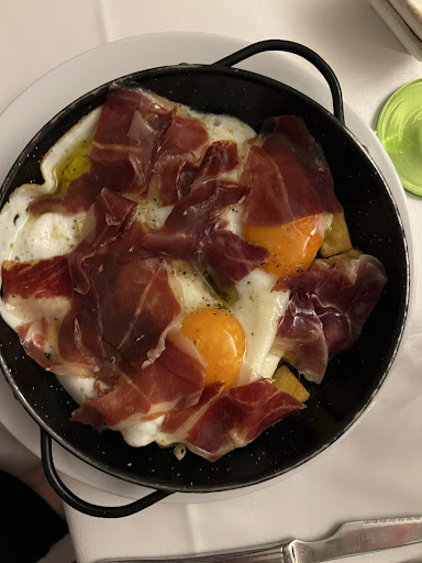 Skirt steak was a bit chewy and served sliced. Due to the slicing it was a bit cool when it arrived at the table. The final dish was fried eggs over fried potatoes with shaved ibérico ham. This is a rustic dish and was served with perfectly cooked eggs crispy on the outside, fluffy in the inside diced and pan fried potatoes. The ibérico ham provided the salt and elevated the simple...