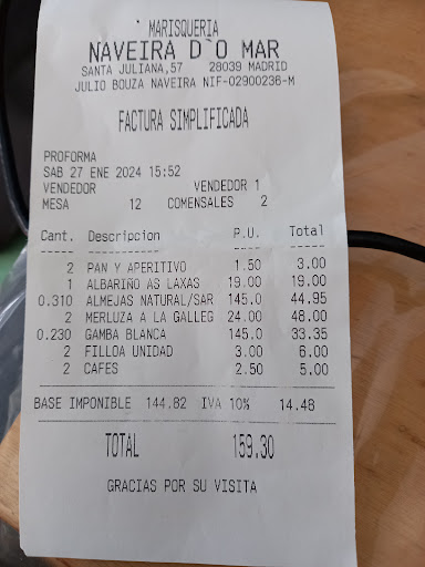 Read moreMi experiencia con este restaurante- NAVEIRA D’O MAR-, muy recomendado y caro, por cierto, ha sido de lo más desagradable. Espero que no les suceda lo que a nosotros, porque ha sido una experiencia desagradable y muy peligrosa. El sábado 27-01-2024 fuimos mi marido y yo a comer allí, buena atención, todo muy rico y aparentemente en buen estado. Sin embargo, hemos tenido una intoxicación alimentaria muy importante, tanto que a mi marido le ha durado tres días y yo aún me estoy recuperando de ella después de una semana, con mediación y dieta estricta. Hoy, he llamado al restaurante, en dos ocasiones, -no para pedir nada, ni denunciarles-, sino para advertir de lo que nos había pasado y el encargado, no se ha dignado atenderme, aduciendo la persona que ha contestado a la llamada, que no se encontraría en el restaurante hasta el próximo martes, cosa absurda, dado que, como en todos los restaurantes del mundo, los días más importantes de ventas son los fines de semana. Adjunto foto...
