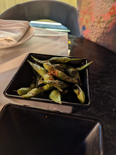 Antes casi ni de sentarte te ofrecen el cocktail del día y unos edamame braseados realmente adictivos. El ambiente oscuro (mucho, se nota en las fotos claramente) y la música alta, hacen que no puedas resistir aceptar ese cocktail (11€/🍸). Con la copa ya en la mesa, y dejándonos aconsejar por el camarero, elegimos los siguientes platos: