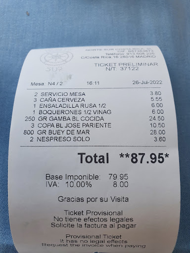 Read morePues fuimos a comer para celebrar el santo de mi mujer y empezamos regular. Hicimos un pedido y donde dijimos una ración de gambas cocidas nos las trajeron a la plancha. A continuación habíamos pedido 2 cigalas medianas a la plancha y menos mal que me dio por decir que las quería ver antes. Y se me presenta el camarero con dos cigalas tronco que pesaban casi 600 gramos entre las dos ( voy a omitir el precio que hubiéramos pagado si no llego a tener esa iniciativa). Y para finalizar, algo que me enseño mi padre. Revisar la cuenta. Y menos mal que lo hice. A ver, un error lo puede tener cualquiera. Pero TRES!!! En la cuenta venia cargado otro plato que ni habíamos pedido ni habíamos probado. Y creo que esto el camarero y el maitre lo deben revisar antes, incluso que el cliente. Se te quitan las ganas de volver. Well, we went to eat to celebrate my wife's saint's day and we started regular. We placed an order and where we said a portion of cooked prawns they brought us grilled. Next we had ordered 2 medium grilled crayfish and luckily I decided to say that I wanted to see them first. And the waiter appears with two crayfish trunks that weighed almost 600 grams between the two (I'm going to omit the price we would have paid if I didn't have that initiative). And finally, something my father taught me. Check the account. And luckily I did. Let's see, an error can have anyone. But THREE!!! Another dish was loaded on the bill that we had neither ordered nor tried. And I think that the waiter and the maitre d' should review this before, even the customer. You lose the...