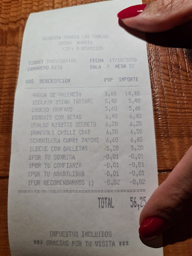 Read moreOchenta Grados Las Tablas es un restaurante ubicado en la zona norte de Madrid, conocido por su innovadora propuesta gastronómica y ambiente moderno. Su concepto se basa en la cocina a baja temperatura, preservando las propiedades y sabores originales de los alimentos. Ofrecen platos en formato “Gastro XS”, permitiendo a los comensales degustar una variedad de opciones en una sola visita.