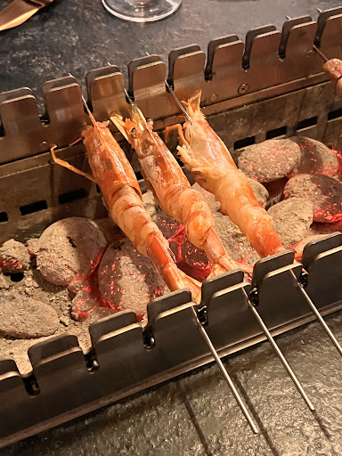 Primera hora del servicio de cena, local de aspecto impecable, mesas con brasas...la cosa prometía. Sin embargo desde el comienzo ya empezó a torcerse. Al ir al elegir la bebida nos traen la carta de vinos y nos indican que no tienen ningún blanco (¿ninguno de unos quince?...podría entender la falta de alguno, pero todos..., lo achacan a problema con suministradores), elegimos un tinto y menú de degustación en el que primaba la carne sobre el pescado. Se hace esperar unos 20 minutos en salir de cocina el primer pase, suponemos que por la elaboración, pero nada más lejos de la realidad...YA QUE LA CARNE LA HACES TU EN LAS BRASAS DE LA MESA. La materia prima es exquisita aunque un tanto escasa, con el resto de los pases ocurre exactamente lo mismo, y el único que está cocinado tiene el arroz duro.