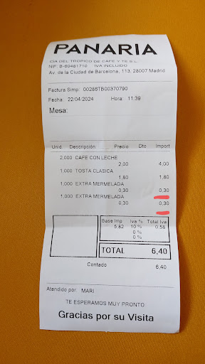 Read moreUna lastima que no se pueda poner 0 estrellas. Son unos completos estafadores. He ido a este sitio porque está al lado de un centro de formación donde acudo para hacer un curso. He pedido un desayuno de pan de centeno o espelta. Algo que ya tienen en casi todos los sitios. No tenían pero la chica que atendía, nada amable me ofrece pan de cereales. Ok, acepto. Me pregunta si quiero un trozo o dos. Le digo que ponga media tostada nada más. Mi sorpresa viene cuando al cobrarme me dice el precio 2,80€. Ese es el importe del desayuno con la tostada entera. Le reclamo, le digo que creo que se ha equivocado y su respuesta ha sido: yo te pregunté si la querías entera. Si se que el precio lo voy a pagar igual, obviamente hubiese pedido toda la tostada. No recomiendo este sitio para nada, encima son unas bordes que se aprovechan de esas situaciones para ganar mas dinero. Menuda política interna. He pedido la hoja de reclamaciones y han empezado a ponerme excusas, que si eso no se podía reclamar, que si no es un buen motivo, etc. Al final, por no pasar mas vergüenza me he ido y he pensado que la mejor queja podría ponerla aquí que al fin y al cabo es un sitio que cualquiera puede ver. Uvepan de la Avda. Ciudad de Barcelona, 113 es una estafa en toda regla. Invito a la gente a que...