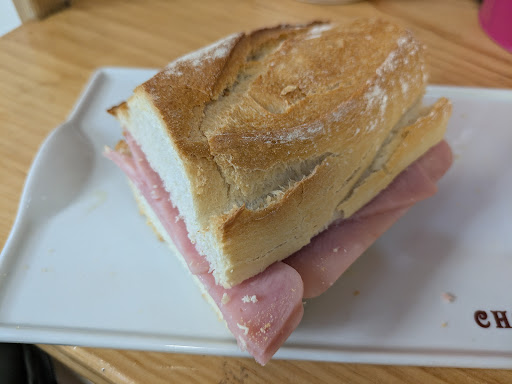 También pedí un bocadillo de jamón cocido, y aunque el jamón en sí no era de la mejor calidad (tipo embutido prensado, más industrial), el pan era excelente. De esos que hacen que todo lo demás mejore: crujiente, con costra rústica, muy buen sabor y textura.