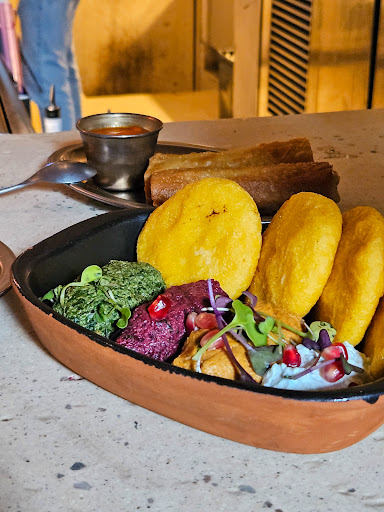 Read moreExcellent choice!!! We had the Sunday brunch today. We stayed downstairs and I was sceptical about the food. I live in the area and I find restaurants in Justicia usually snob and pretentious. I have to admit I was impressed positively with the place. The brunch is not cheap: 45eur but automatically the crowd is nicer, international and respectful. In the end it was an awesome experience. One of the owners came to say “hi”, the staff was polite and friendly asking for advices and improvement areas . Finally the food was generous, tasty and colourful . It is Mediterranean style tapas with a Georgian touch. One small detail that made me blushed: I loved the apple pie part of the brunch set of desserts and we were already in the street and the waiter brought me a piece of the tart for free for take away. Incredibly sweet. Kudos to the waiter who had the idea. I will come...