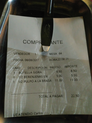 Read moreLuces y sombras Luced Los camareros muy atentos, y rápidos. Las berenjenas con hummus están muy bien. Buena idea, cantidad suficiente y sabores ricos y bien maridados. El hummus suave, y viste a las berenjenas a la perfección. Sombras: Actualizando críticas anteriores de otros comensales, el precio de la botella de sidra guipuzcoana 6'50. Para un día puede no estar mal pero para tomarse dos o tres es para pensárselo. Lo del pulpo no tiene nombre. Pedimos media ración de pulpo, venían 4 mini tentáculos de pulpo en un plato de diseño con una nube de patata en el medio. Al principio pensamos q era demasiado poco para media ración que cuesta unos 11€ pero después agradecimos que el pulpo apenas hubiera tocado el plato. Creo q ese pulpo hacía mucho tiempo que había dejado el mar y que en su camino al plato no había sido tratado en condiciones, el sabor a pescado, fuerte inundaba la boca dejando cierto regusto a amoniaco. Una vergüenza. No obstante escuchando los comentarios de otras mesas q habían pedido carne parece que los comentarios eran más que favorables. Habrá que probar si elegimos mal el plato, si es que mi estómago aguanta el combate de esta noche con el abuelo del kraken. Si no escribo...