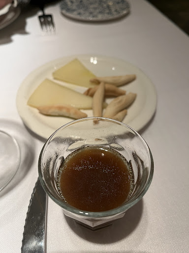 Read moreThis restaurant was recommended to us for great gambas al ajillo and they did not disappoint. It’s a pretty restaurant and I being able to dine before 9 pm (thank you!). The meal started with some flavorful, rich beef broth and some cheese. Our server was very nice and recommended a very reasonably priced wine. The pan con tomato was great. The bread was nicely toasted and drizzled with some very nice olive oil. The portion of ham was very generous and it was melt in your mouth tender. The star was the gambas al ajillo. It came out bubbling in olive oil, full of tender shrimp, crispy garlic, and chiles. So good! And the bread is perfect for soaking up the delicious oil and garlic. We pondered going back again on our visit, it’s that good. Until next...