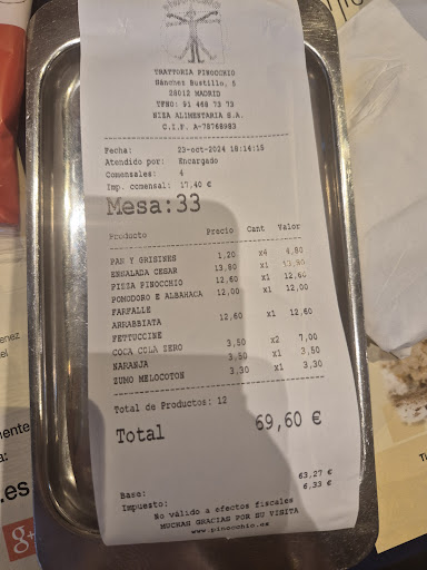 I've eaten many pizzas in my time on earth, but I'm afraid to say this was by far the worst. After a lovely visit to the Reina Sofia gallery opposite, expectations were high for a nice late lunch at the Pinnochio Sánchez Bustillo, with the promise of freshly made pizzas and '100% natural ingredients'. Staff were friendly and service was swift, but when the pizzas arrived I was mortified. Small, over cooked, and tasteless, it was an awful exerience.