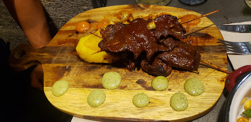 Mientras estábamos terminando de comer el segundo plato y del plato del ceviche solo terminamos comiendo el chicharrón, la misma camarera pasa con un plato de anticuchos (parrilla de corazón de res con salsa especial) el cual venía salpicando desde la cocina, el plato pasó muy cerca del otro comensal de mi mesa manchando su abrigo.