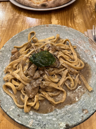 I've read somewhere that this is specialized in pizzas, and they have a very attractive set of them, but our experience today is also quite good with the pastas, even if they are not at the point of sophistication (with fish stews and all that) of places like Nonsolocaffe (Ríos Rosas) and La Tavernetta (Alonso Martínez).