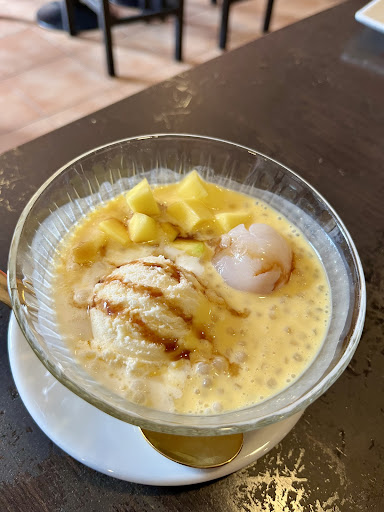 Postre: Mango y lichi con helado de vainilla y tapioca. Bastante interesante, me recordó a mi merienda en Taroquísimo. Brownie con helado de vainilla. Sorprendentemente bueno, no se si sería casero pero estaba muy rico. Respecto al helado, no me gusta la vainilla.