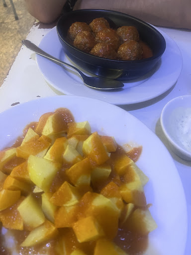 When I stepped into this restaurant, I felt a kind of just normal estaurant ambients like not kind hostess, no saying ‘Hi’… But I asked bartender that I can eat something and then he guided me inside. Few minutes later, I ordered a grilled steak, calamares, one cup beer and a cup red wine. These are all I ordered. First a beer and wine came out, I really was astonished when I saw them. A size of beer was like small cafe con lache cup, wine tasted pike vinegar almost. Prices was €1.7 for a beer and €2.5 for a wine. But so far was just kidding, a calamarres was dilivered with 2 pieces of baggettes and 5 pieces of fried squis rings with no souce or any seasonings. And finally a grilled steak showed up, it was just trash(€9.5) with some dices potatos. I know it wasnt that price that I could expect good quality. But I had to use all muy energy to chew it. It was good meal with a grilled rubber and cold fried squid rings, a red vinegar, too small beer. Anybody stop and enjoy here these...