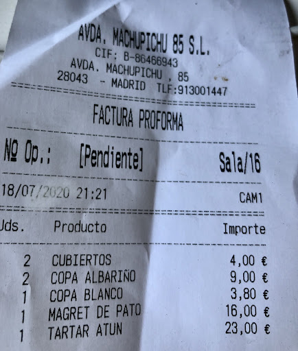 Read morePedimos para compartir el Marinado de Atún con Guacamole y piñones el cual tenía un exceso de pimentón picante que enmascaraba el sabor del atún y el guacamole (Terminado el plato lo único que quedaba en la boca era el picante) Seguimos con un Ceviche de Corvina que estaba extremadamente picante. Creo que sería de recibo que indicaran el nivel de fortaleza que tiene este plato (he estado en muchos restaurantes peruanos y siempre hacen hincapié en este "pequeño detalle"). Comentamos al camarero el problema "con el sabor picante" de los platos y nos dijo riendo que tendría mal día el cocinero. No creo que ante un comentario así del cliente la respuesta correcta sea esa