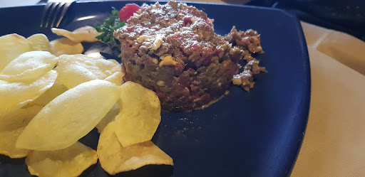 Por último, comimos Villagodio de vacuno. Nos indican que no viene con acompañamiento y que nos recomiendan unas patatas soufflé con pimientos. La carne muy buena , pero los pimientos muy muy picantes, no se salvaba ninguno. Dejamos todos los de la ración en el plato.. Si nos quejamos de picante en los anteriores platos no nos deberían ofrecer esos pimientos, no?. Dimos por hecho que al ponerlos no tendrían que estar tan fuertes, error nuestro al no asegurarnos