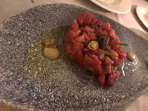 However, the prices for the amount of food presented was appalling. An entree of tuna tartarre at 25€ was pitifully sized (and not that great) my husband’s is much better and my order of sauteed razor clams, (which are themselves very small), was presented as a plate of 8 clams, only 7 of which were opened— 24.5€. The waiter (with no sense of irony), asked if we were going to share this plate… These two dishes were NOT listed as tapas.