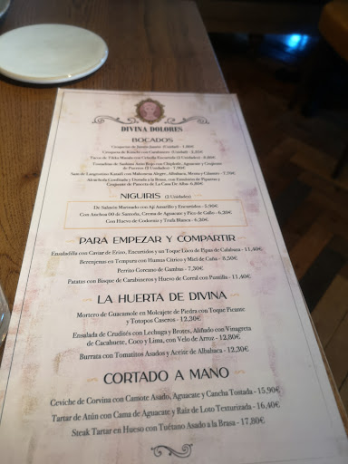 El trato de los profesionales que trabajan allí, un 10, son encantadores, super atentos, cercanos, saben como hacerte sentir especial. Me ha gustado mucho que te recomiendan como disfrutar mucho más de cada plato y que cuando les pides algo lo gestionan con prioridad y rapidez. También me gusto mucho que son capaces de reaccionar ante cualquier mínima incidencia (esto no es para nada habitual). Pedimos un plato sin cebolla y nos lo trajeron con ella, lo que hicieron fue poner uno nuevo sin cebolla y dejar el que ya habían traído sin coste (cuantas veces me habrá ocurrido algo así y lo que suele ocurrí en estos casos es muy distinto, en Divina Dolores saben reaccionar y te generan un WOW! ). De verdad, un 10 para la persona que lo gestionó, creo que se llamaba Tony, aunque todos los que estaban hoy allí fueron geniales. Gracias por el buen ratito que nos hicisteis pasar.