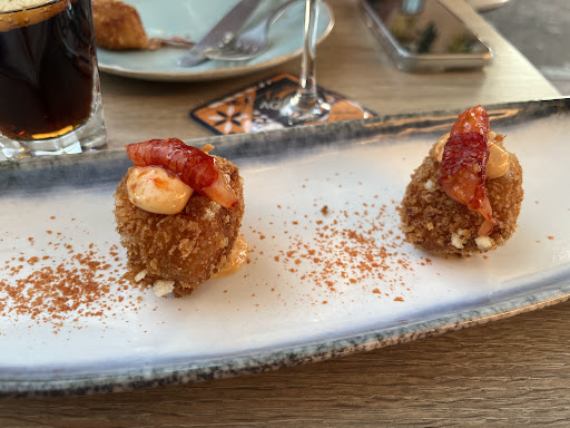 Nos pasamos por segunda vez para cenar un mes después. Esta vez en la terraza de fuera. La oscuridad se soluciona con una lámparita que se agradece. Las croquetas muy bien como la primera vez. Los Sam de langostinos recomendables. La ensaladilla con "caviar", muy insípida. Dejamos una parte. Y los crepes japoneses nada que destacar.