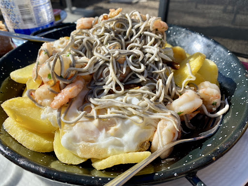 En esta visita probamos: -Croquetas con jamón (10€, 6 unidades): Muy ricas, como las de tu madre. Grandecitas y con la bechamel un pelín densa. Están algo aceitosas, pero aun así de sabor nos gustaron mucho. -Chipirones andaluza (16,90€): Un buen plato de chipirones grandecitos rebozados con ensalada. Buena calidad de producto. -Mandahuevos Gulas Gambas (18€): El plato que más nos sorprendió. Es un espectáculo y contundente como él solo. Las gambas muy gorditas, mucha cantidad de gulas y una fuente enorme de patatas con cuatro huevos. -Pulpo braseado con patatas revolconas (22€): Pulpo tiernecito, mucha cantidad y con un sabor a brasa muy rico. -Entrecot con patatas y pimientos del padrón (23€): Punto perfecto y pieza de muy buena calidad. También se nota el sabor a brasas. -Tarta de queso (6€) y Filloas rellenas de crema (6€): Pedimos una tarta de queso y por cortesía de la casa nos trajeron este plato, por lo que las cantidades pueden variar respecto al plato original. Postres que no pretenden destacar, pero con buen sabor.