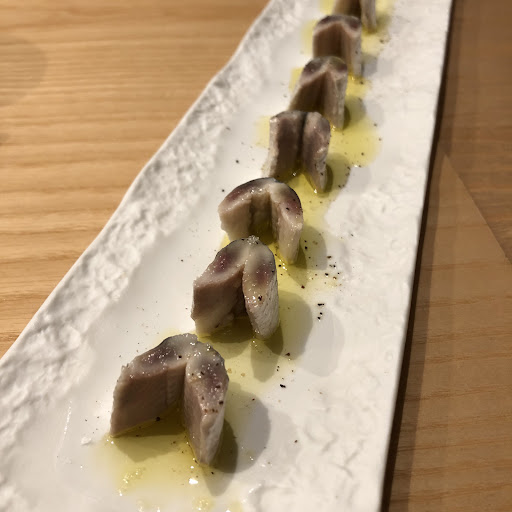 Sin pedirlo, pusieron dos aperitivos por 3€ que resultaron ser lo mejor de la cena. Dos aceitunas gordales por cabeza, excelentes de sabor y textura y medio boquerón en vinagre cortado y presentado de manera alternativa aunque con exceso de aceite.