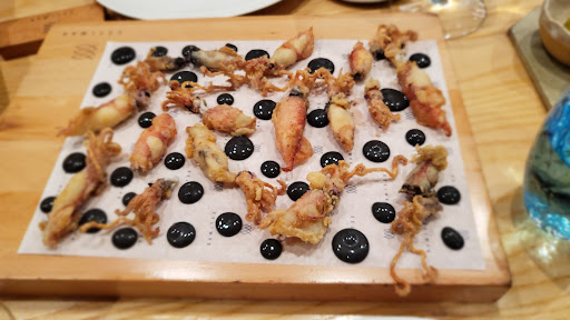 Chipirones rebozados a la andaluza con mahonesa de su tinta. 26€. Excelentes. Pelados, secos y crujientes. Creedme, hermanos, si os digo que había 13 unidades. Ni 100 gr. Tal cual. Acompaño foto en la que se puede discernir el tamaño porque estoy al corriente de la polémica sobre puntillitas, chopitos y chipirones. Acompañaba una mahonesa negra innecesaria que se quedó en el plato tras la cata.