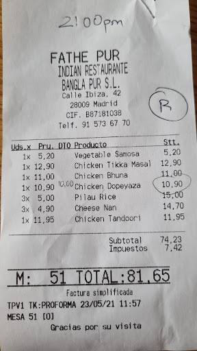 Read moreFathe Pur ha sido uno de mis restaurantes favoritos para comida india durante varios años, sobre todo porque preparaban los platos clásicos muy bien y el servicio era ameno. Este fin de semana he tenido una mala experiencia con ellos. No estoy seguro si ha cambiado de dueño pero no cabe duda que hayan cambiado las prácticas en la cocina. Consulté en su página web e hice un pedido por teléfono. Pregunté si me lo podrían entregar en casa porque vivimos en el barrio y me dijeron que "el repartidor a veces llega tarde" y ante la duda evidente, decidí recoger el pedido yo mismo. Había pedido un nivel medio de picante, pero sólo uno de los curry era así. Las piezas de Pollo Tandoori seguramente eran de la noche anterior. El Arroz Pilau ha cambiado de receta completamente. Lleva semillas de comino pero ya no viene con semillas de cardomomo o canela. Han añadido cebolla frita y guisantes y parece más una racíon de arroz especial chino y no tiene nada que ver con el arroz aromático y ligero que preparaban allí antiguamente. Los curry también eran decepcionantes. El Pollo Tikka Masala demasiado dulce para mi gusto. El Pollo Dopiaza era una mezcla de cebollas hervidas añadidas a una salsa Korma sosa. El Pan Nan de Queso era seco y muy posiblemente recalentada de la noche anterior. Para colmo de la experiencia, no me dieron el descuento del 10% por recoger la comida y llevarlo a casa. Les llamé para reclamar y me dijeron que el precio de comida para llevar es el mismo que se aplica en el restaurante. Sabrán que muchos restaurantes ofrecen un precio menor en la comida para llevar, pero posiblemente no les interesa aplicarlo porque eso hace la competencia al acuerdo de descuentos que tienen con El Tenedor. Si sois amantes de la comida india y habéis comido aquí anteriormente, creo que quedaréis muy decepcionados con esta última versión del FATHE PUR. Recomiendo ir al barrio de Lavapies para comida india...