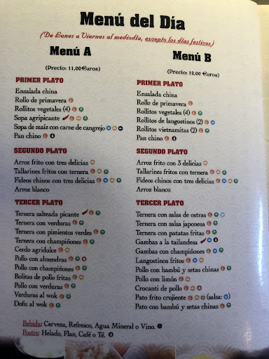 Fui a cureosear el menú, vivo hace 4 años en el barrio y no había ido nunca. Fui a por el Menú B de 12€, mas suplemento de arroz, bebida cerveza pequeña de lata Mahou 5 estrellas, flan de postre. Mi experiencia es mala regular, las cantidades sin muy escasas para satisfacer a cualquier consumidor. Son sólo dos rollitos con su salsa, que no me la han explicado, con tallarines salteados con ternera, verduras, soja,etc. Sinceramente muy escasa la pasta. Cuando viene el plato principal, le adverti al camarero que si viene la pechuga de pato frita sin guarnición, que me la trajera. Me respondió atento que las cantidades eran las adecuadas para mi satisfacción… Tu pedir el extra de arroz. La calidad: el sabor de los rollitos era de aceite muy usado, para ser de verduras tenian sabor a carne. El pato sabia a muy tostado…como los rollitos… Todo me lo entregaron casi a la vez. No me preguntaron por segunda bebida o café con mi postre. Podrian proponer mejores cantidades y presentaciones. No hubo aperitivo...