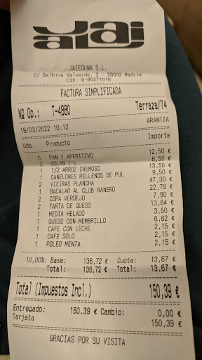 Read moreFuimos por primera vez a Jai Alai 3 adultos y dos niños, uno de 4 años y otro de 1 año. Cuando reservamos avisamos que la comida de los niños la llevaríamos de casa. El recibimiento fue muy bueno, la mesa era ideal, en la terraza cubierta que es preciosa. El trato de los camareros nos pareció muy profesional, la comida estupenda, de entrantes pedimos media ración de arroz cremoso y media ración de canelon relleno de pularda y ambos estuvieron riquísimos y especiales. De principales, pedimos vieiras con alcachofas y changurro y bacalao al club ranero, muy buenos ambos. El postre fue tarta de queso y queso idiazabal con membrillo, delicioso, la tarta de queso fue excelente. La verdad que una experiencia estupenda, solo empañada por una contestación de la encargada de sala que nos dejo estupefactos. Cuando nos trajeron la cuenta advertimos que nos habían cobrado el entrante de canelón entero cuando habíamos pedido media ración, también comentamos que nos habían cobrado 5 pan y aperitivo por 12,5 € (es decir, el pan) cuando únicamente habíamos comido 3 adultos, a lo que nos exclamó que los niños también habían comido pan y habían tirado trozos al suelo. La cara del pobre camarero que nos había atendido al oír a la encargada darnos tal contestación fue de pura vergüenza ajena. Así que únicamente cambiaron el precio del canelón y nos cobraron los 5 panes, adjunto foto de la factura. Es una pena, porque hasta ese momento estábamos encantados, pero nos arruinó el final de la comida con esa contestación tan cutre en un sitio con tanto nivel, nos fuimos pitando de allí obviamente. Pese a este desagradable detalle, que ciertamente es bastante cutre, lo demás estuvo muy bien. Tomamos dos copas de vino blanco y con todo lo comentado salimos a 50 € por comensal, total factura 150 €. Si no fuera por el comentario de la encargada de sala que nos contestó tan desagradablemente le daríamos 4 estrellas, pero nos sentó tan mal la contestación y el trato recibido, que no es propio de un restaurante con tanto nivel y solera, que siendo honestos y con todo nuestro pesar tenemos que calificar a Jai Alai con apenas...