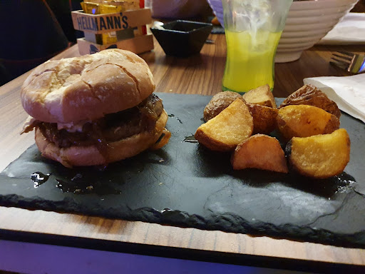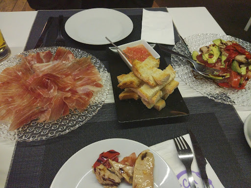 La comida que probé no estaba mal pero el servicio me decepcionó: avisamos a la camarera que nos atendió de que yo no comía carne y pedimos un plato para cada uno y unas bravas y unas croquetas de boletus para compartir, cuando llegan las croquetas y parto una a la mitad me doy cuenta de que son de jamón, aviso y viene al rato a decir que de boletus no quedan que si queremos de trufa, le pregunto si llevan carne para pedir otra cosa si no, nos dice que no lleva y aceptamos. Cuando nos traen los platos yo había pedido unas berenjenas con salmorejo y me las traen con un acompañamiento de bacon frito, lo aparto de mi plato y lo dejo pasar. Cuando nos traen las croquetas de trufa y empezamos comer me saben a carne y las inspecciono confirmando que llevan jamón y las devolvemos avisando de que habíamos pedido eso porque nos habían dicho que no llevaba carne. Al final tuvimos que pedir una segunda cuenta sin las croquetas porque nos las habían cobrado en la primera. A mí la noche me la dieron porque ya se me revolvió el estómago pero no pasó de ahí, si esto le pasa a alguien con alergia o intolerancia y tienen estos descuidos, acaba la noche en el hospital. Creo que esta camarera debería aprenderse lo que llevan las cosas de la carta o preguntarlo al menos en cocina si alguien le avisa de que no come algo en concreto. Ya había estado anteriormente de menú y un camarero nos atendió muy bien pero no creo que vuelva porque no tienen apenas opciones vegetarianas o...