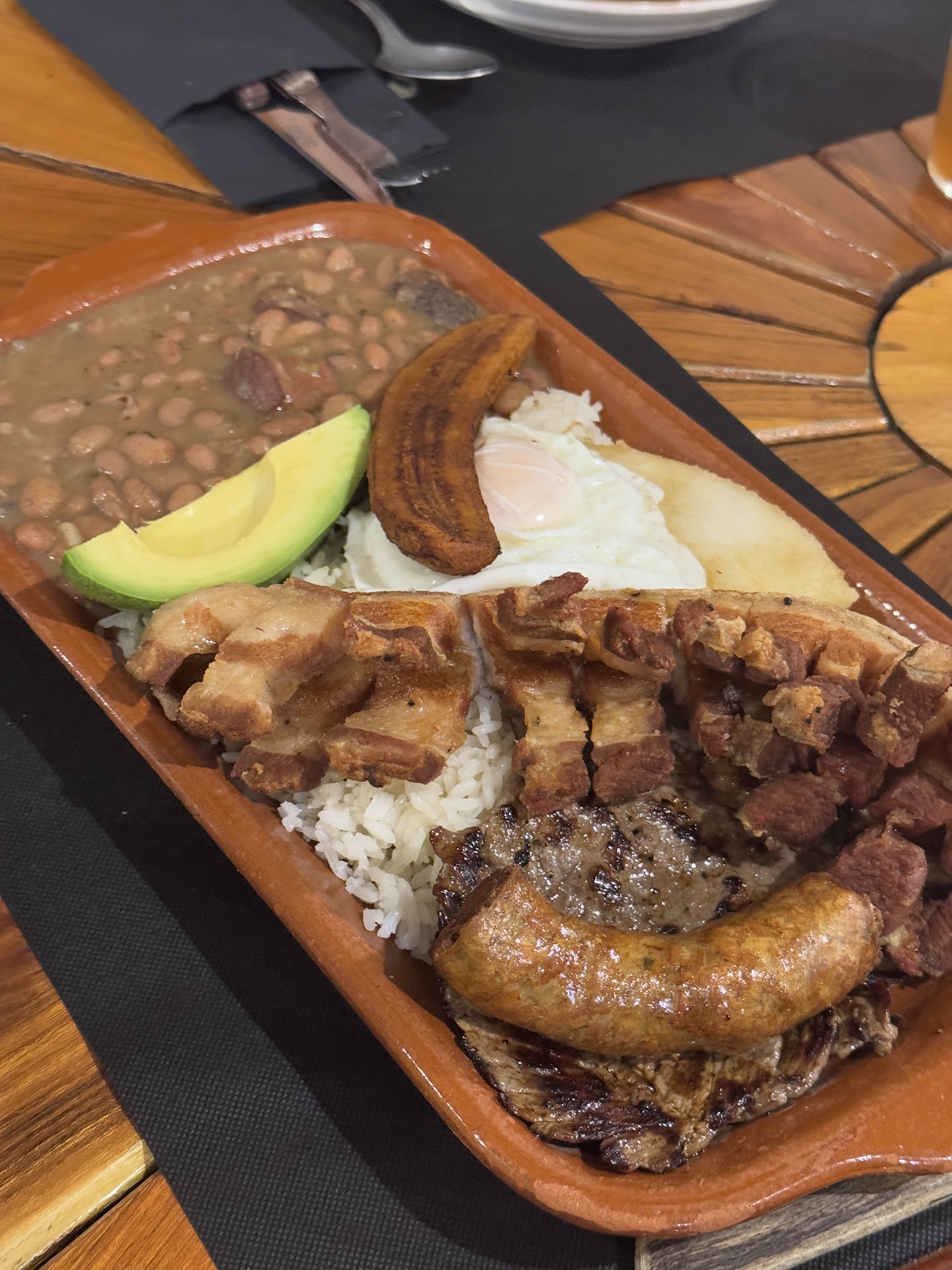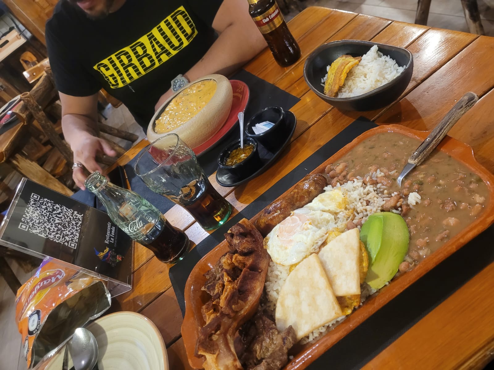 Sin embargo, la comida en general nos dejó más que satisfechos. La bandeja paisa fue, sin duda, la mejor que he probado en toda mi vida: generosa en cantidad, con ingredientes bien preparados y un equilibrio perfecto entre cada uno de sus componentes. La carne en su punto, el chicharrón crujiente y delicioso, el arroz esponjoso y los frijoles con ese sabor casero inconfundible. Pero, si bien la bandeja paisa se llevó muchos aplausos, el plato que realmente sorprendió en la mesa fue la crema de mariscos. Su textura cremosa y su sabor intenso nos dejaron maravillados, convirtiéndola en una de las mejores elecciones de la noche.