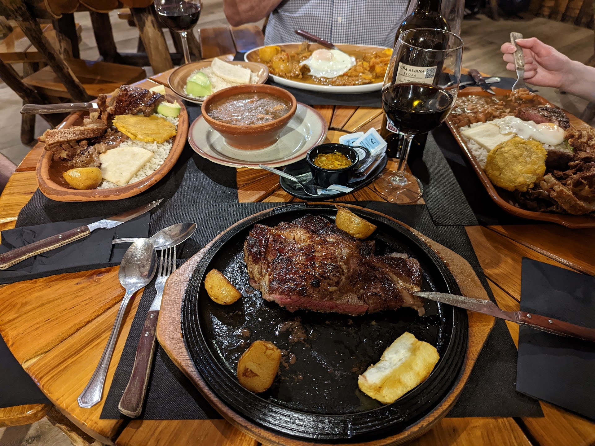 Read moreThis restaurant has atmosphere and a lot of Colombia artifacts. But the wine is very good by the bottle and the food is unbelievably good. We had the meat platter and the steak and it was huge. It came with big platters (not plates) of rice, beans, sauce and potatoes, yucca and various kinds of meat. When you come here, be sure you are hungry. Good value for the prices as well. The four of us ate like kings with wine for under $100 Euros. This restaurant is the best so far in Madrid and we have been eating out...
