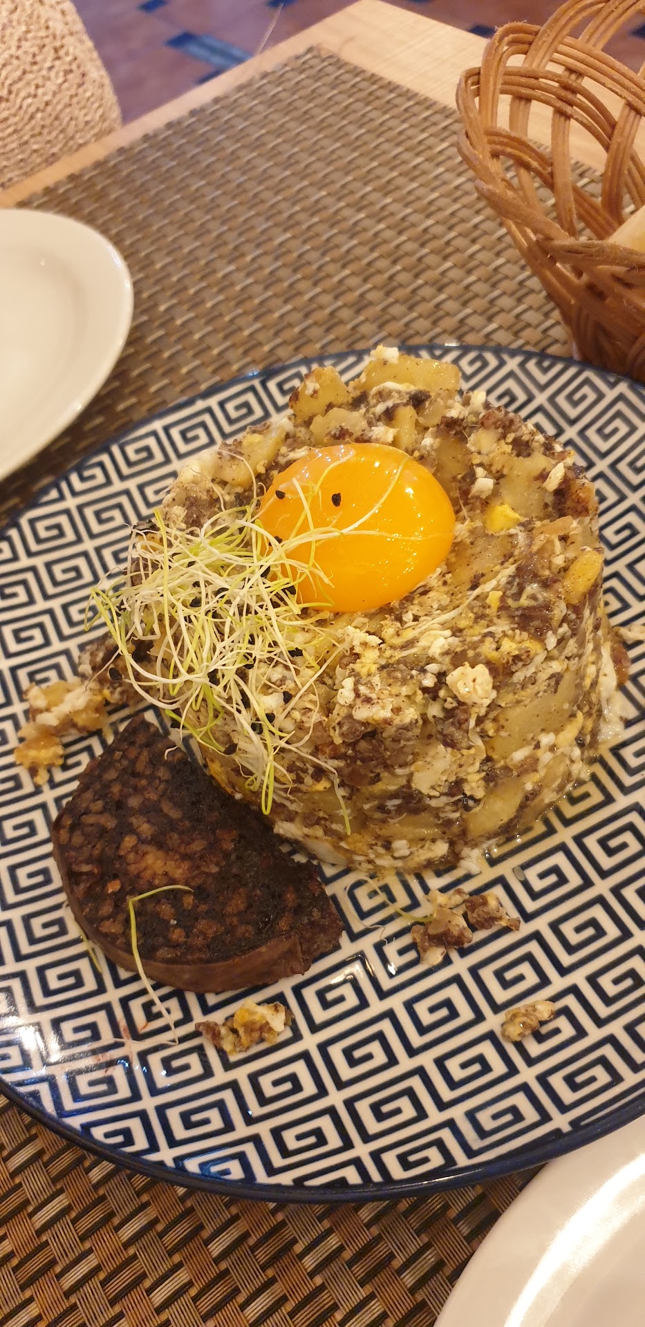Huevos......muy ricos. Aunque parezca pequeña por la foto, es una ración generosa para compartir 2 personas. No esperéis la tipica patata frita.....es cocida. Por poner una pega, apenas aprecié el sabor de la manzana. Para repetir.