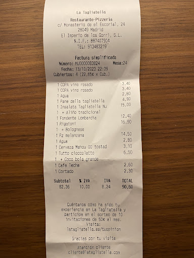 Read moreEl peor Tagliatella que he visitado en Madrid y he estado en 4 de allí. Lo peor: .servicio. La mesa empezó con comensales a las 14:30, hora de reserva. La mesa estaba completa y con cartas a las 14:40. No se tomó comanda de comida hasta las 15:15 tras llamar 3 veces a los camareros. La comida se sirvió a las 15:45. Faltaba bebida que se pidió dos veces porque nos habíamos tomado la primera bebida y aún no llegaba la comida. El aceite de la casa se pidió dos veces, el picante, y no llegó nunca. La mesa donde el pizzero deja las comandas listas, desbordada. El pobre no podía ni seguir trabajando. Comimos con sed porque tardó 25 minutos en llegar las bebidas de segunda ronda hasta que se pidió . En el surtido de postres uno iba con velas de cumpleaños. Nos levantamos dos veces a explicar cuál era para que fuese bonito. Y era un postre fácilmente identificable. Salió mal. Y por último en el surtido de postres, los coulan con helado, se sirvieron fríos por dentro (cuando un coulan de chocolate está derretido por dentro) Pagar 30 euros en este Tagliatella no merece la pena. Hay miles en otros sitios.