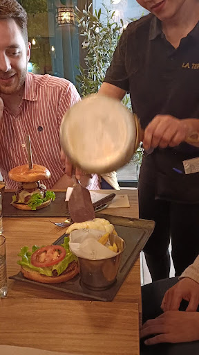 Uno de esos sitios que te sorprende de verdad. Estuvimos en La Terrazza y salimos encantados. El local tiene un ambiente muy chulo, tanto dentro como fuera en la terraza, está super bien decorado, ideal para comer tranquilo o tomarte algo con amigos. Se nota que cuidan los detalles. La comida de diez. Pedimos croquetas caseras, un par de hamburguesas y unas costillas y todo estaba buenísimo. Las hamburguesas fueron lo mejor de la noche, la trufada y la de Jack Daniels estaban espectaculares, la carne muy jugosa y los sabores bien potentes. Se nota que trabajan con buena materia prima. El trato del personal fue genial, atentos y con muy buen rollo en todo momento. Da gusto cuando te atienden así, rápidos pero sin agobiarte, te dan tu espacio y un muy buen trato en todo momento. Probamos las costillas BBQ y estaban top. Para cerrar, pedimos tarta de queso y helado… brutal. Todo bien presentado, buena cantidad y con sabor casero de verdad. Es un sitio al que volvería sin pensarlo. Comida muy rica, ambiente agradable y buen servicio. 100 %...