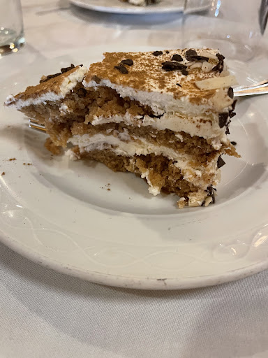 The food was delicious. We ordered from the daily menu. They gave us a baked potato and cream on toast as a tapa. Then a basket of fresh bread arrived. Our starters were spaghetti with prosciutto and tomato/buffalo mozzarella salad. Our main courses were chicken wings with potatoes and peppers and Iberian tender loin with potatoes and pepper. For dessert we had carrot cake and apple pie. All of it was delicious. The carrot cake was exceptionally moist. The apple pie had cream on the bottom.
