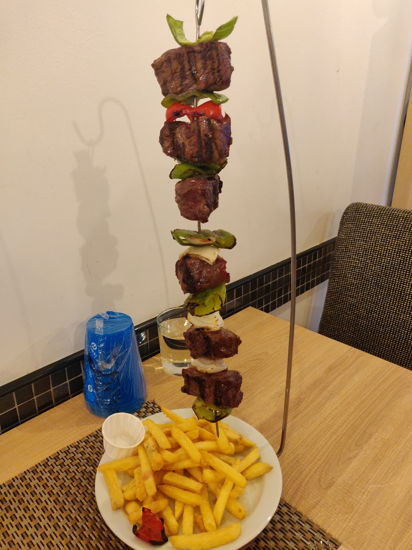Brochetón.......jugoso. Conocíamos un sitio donde lo llamaban colgados....Brocheta grande de ternera, con cebolla y pimiento verde y rojo. La pedimos al punto. La carne muy rica de sabor y jugosa. Pega.....heché en falta un pelin más de cebolla al final de la brocheta. Repetiremos.