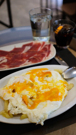 Okay, let's get started. As you may have read in previous reviews, this is a famous place for Huevos Rotos (fried eggs cracked over potatoes)(french fries). We came right after opening and had no problem getting a table. At the table there is a basket with bread(not good, warm bread that one usually wants to eat with breakfast, we are talking about cold, hard, and was made yesterday bread). They have a QR code menu that is very simple to use. So far, so good minus the bread that will shatter your teeth if you dont soak it first. We ordered the regular Huevos Rotos and the ones with Bacon and two waters. The plates come out and they do look beautiful, but so do cakes covered in fondant (and that tastes like fecal matter, but I digress). The eggs and bacon were actually pretty soild. They had negative amounts of salt and pepper, but seasoning is subjective, so I guess I won't knock them for that. The issue though is the potatoes (french fries). These were 1000% frozen and then thrown in oil that was no where near hot enough, which created a plate of super oily cold french fries which were then drenched in egg yolk. They charged 10.50 euros for this. A plate of undercooked french fries with two eggs and some chopped up bacon... That plate was a sin and I could have made better blindfolded with only my feet. It was actually disrespectful that they proudly served that. We asked the waiter if the fries were frozen and he quickly looked away and said "No, they are made daily". "Sure buddy I can open a freezer bag of fries daily too". When we got the check, it was the final nail in the coffin. They charged us for the two cold rocks of bread that were pre put on the table before we even arrived. We didn't order or barely even attempt to eat these boulders they called bread.
