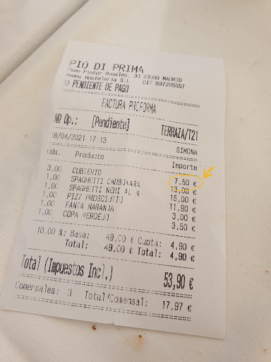 La sorpresa llega cuando pedimos la cuenta, la cantidad final a abonar no me cuadraba... ¡CUBIERTO 7,50€!... que por supuesto me negué a pagar, tras ellos justificar que se cobra siempre, que viene en la carta y que cubre los gastos como pan, agua, mantelería y la no reserva (estas tres últimas es ilegal cobrar por ellas)...