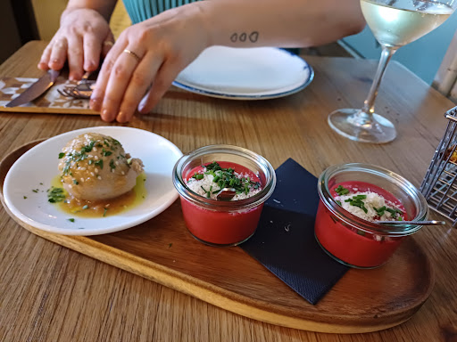 Read moreMy wife and I made a reservation in advance for our last evening in Madrid. Since we arrived a little early, the chef came out to us and offered us a drink while we sat outside. The waiter was professional, smiling and very sympathetic and asked us if we were very hungry. When we said no, he offered us the short tasting menu (6 dishes) and this gesture in itself was very nice. And most importantly, the food was flawless, delicious and creative and each dish was better than the last. In addition to the menu, we got an anappetizer of two small glasses of wonderful gazpacho with pate on the side, and homemade bread.The organic dry white wine, Verdejo de Menade was also great. And so was the dessert in the style of the French thousand leaves with a wonderful cream between them and a scoop of coffee ice cream See you at the next Michelin...