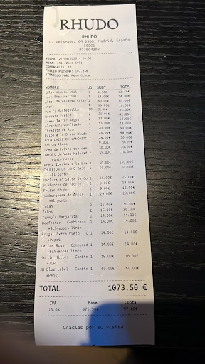Read moreWe went with a friend in a Friday night, and we were really hyped up because Rhudo’s food is a creation of Paco Roncero chef. However, it was disappointing. We ordered: “fideos con carabineros” (min. 2 pp) 2 glasses of wine 2 cocktails called Rhudo 2 apple pie dessert, but for some reason only 1 was served to the table