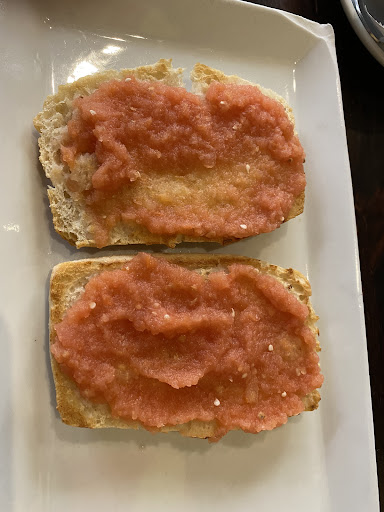 Entramos. Todas las mesas con cartel de reserva muestran un plato con un par de mini panes de picatostes con una lámina semi transparente de queso, o lolo embuchado, por encima.