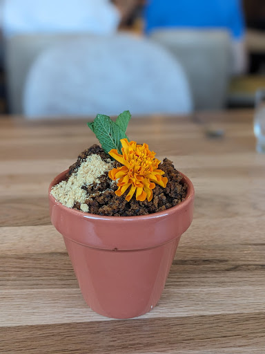 Then we ordered what we thought was going to be carrot cake. It " a very very deconstructed" dessert, came in what seemed to be a small plant pot. Okay first of all it fell all over the table while trying to find out what's under the "dirt" or cake. Then we found some white cream (not creamy, tangy, very sweet or carrot-cakey) then we thought "meh" what have we done. Then I was tired of the dry cake and unexciting cream and as I pushed the spoon further down: gush!! A flood of semi-clear liquid appeared and startled me. It was apparently some type of pineapple juice or something. No bueno!! It is was not great. It just made the rest of the dessert too wet and even more confusing. I couldn't eat it. My date mixed the remaining ingredients and after making a wet dirt (cake) mud of sorts, decided he didn't want to throw it away, so he finished it. Not with very much enthusiasm, I must add.