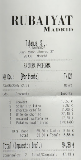 Read moreRubaiyat Madrid is, unfortunately, not worth the price. Calling the portions small would be generous — they are tiny. For a steakhouse with premium pricing, the value simply isn’t there.
