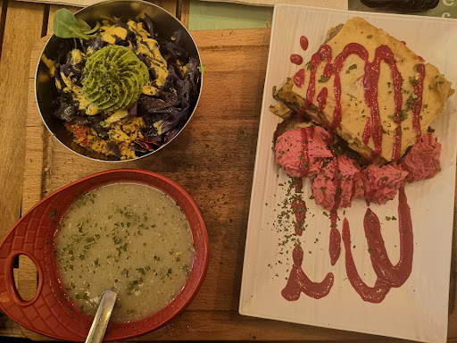 I went a couple of times last month. The 1st with a friend and we absolutely loved it. 🥔🍅🌱The baked potatoes crowned with quinoa, tomatoes and parsley found their way to my heart. I also ordered the Sony Lasagne and asked for it to be gluten free. 🥦It was also really nice but the side broccoli was undercooked and a bit hard to eat. The sauces on the plate were delicious. 🥬The Spinach seemed like it hadn't been washed properly (if washed at all) as you would get the crunch from the remaining soil in them. 🍹We also had a juice that was good. The 2nd time, a few days after, I took my family (who isn't vegan) for my birthday as I thought it would be a great place to leave a good impression on them. However the experience was nowhere close to the 1st. 🕕We ordered 3 menus of the day that we thought were never going to come. The waiter had to come back to the table 4 times even after 30min of ordering to change our choices as they had run out of what we wanted. We were quite upset as someone who arrived and placed their order after us received the empanadas we had been told (after ages of waiting for our food) were out of stock. 🍲The soup tasted like packet soup. Mine was cold and my aunty's was boiling hot. 🥗The Spinach in the Couscous bowl was again crunchy. The lasagne tasted just okay after the whole experience. 🍡For dessert as there was nothing left from the original menu of the day, we had a little banana chocolate shake and fruit sticks. If it hadn't been for the 1st experience I would have rated 1-2 stars and said I would never return. 🌱 Vegetarian restaurant with a good selection of vegan options⁣ 🙋🏼‍♀️ Staff were nice, service slow 🏠 I would avoid going for lunch as it gets busy and seemed like there aren't enough staff. The evening I spent there was lovely. 💶 Around 15€/person. Worth it the 1st time. Expensive the 2nd.