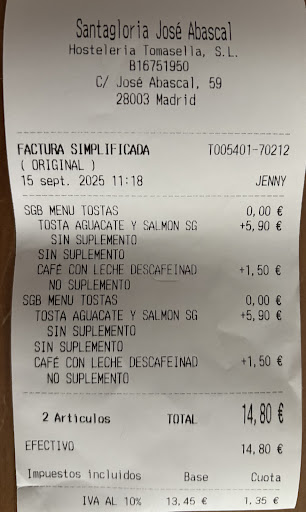 Pido dos desayunos con tostas de salmón y aguacate y los abono (aporto el ticket). Pero al recoger la bandeja se me cae accidentalmente un plato y se me rompe.